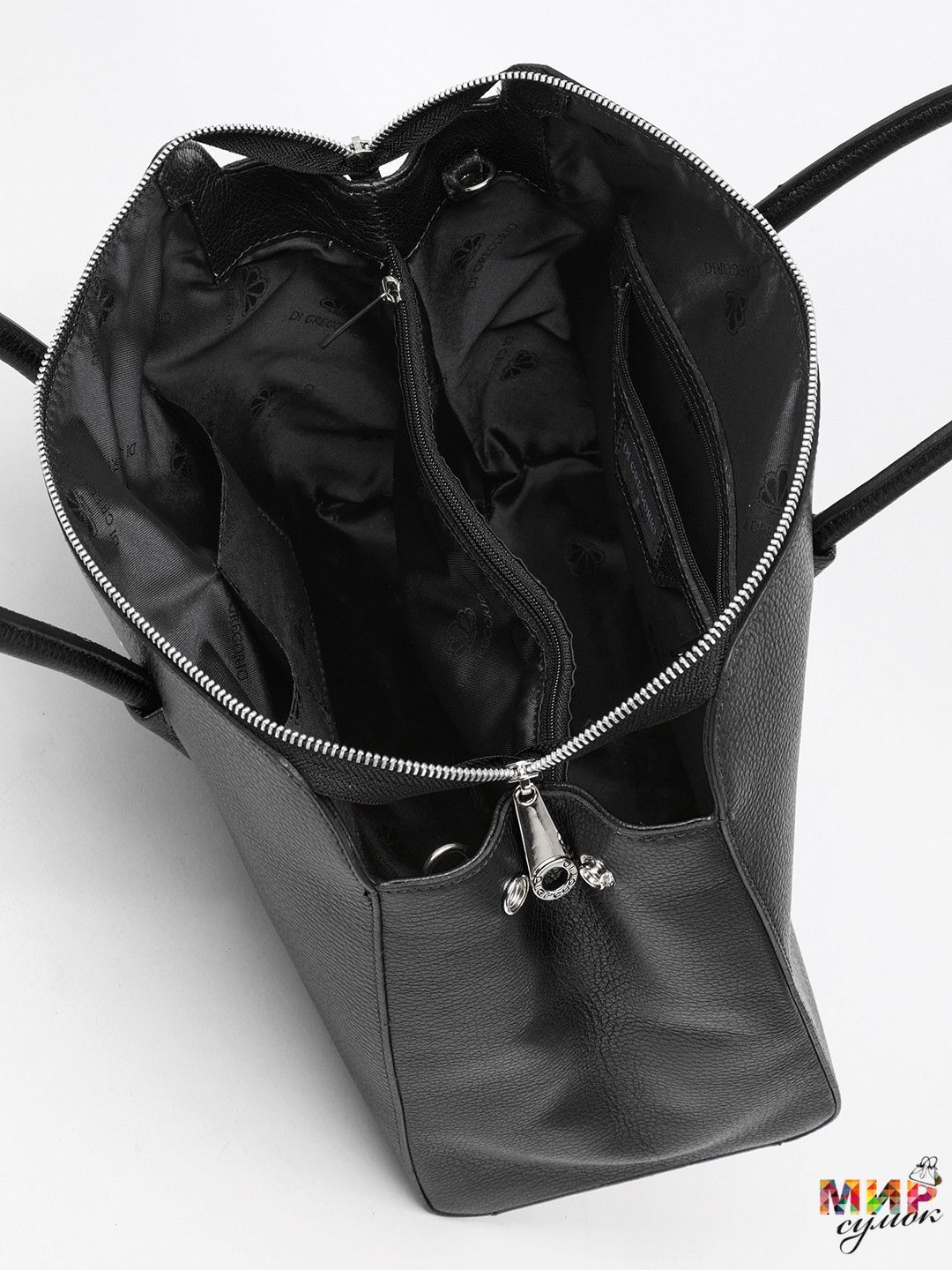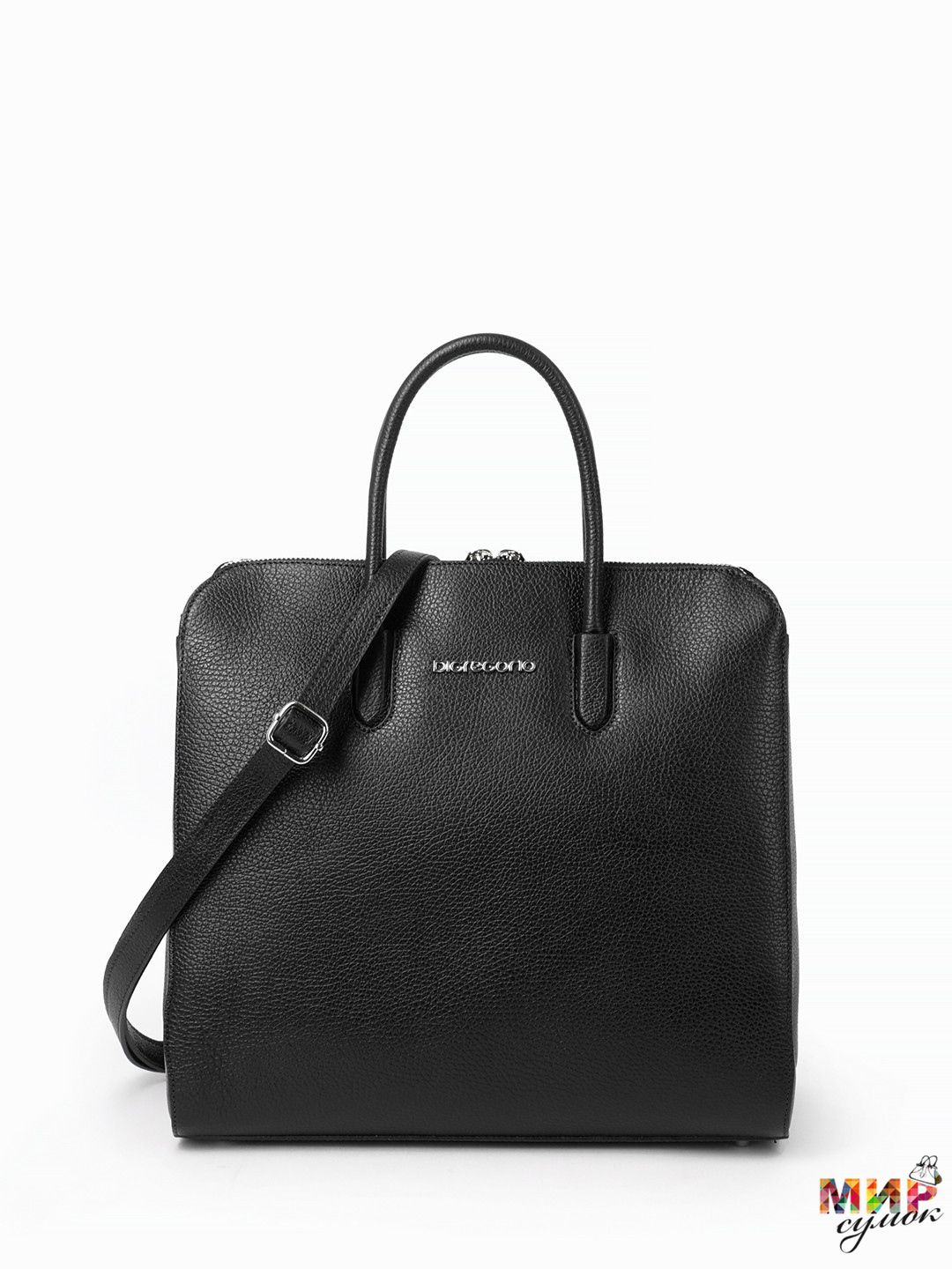 Длина деловой сумочки Di Gregorio (Ди Грегорио) - 33,5 см, ширина по дну - 14,5 см, высота - 32,5 см, общая высота - 45 см.Сумочка закрывается на молнию. Внутри центральное отделение на молнии, сбоку карман на молнии, кармашки для мелочей. Поместятся документы формата А4. Сумочка носится на сгибе руки или в руке. Прилагается длинный регулируемый ремешок.