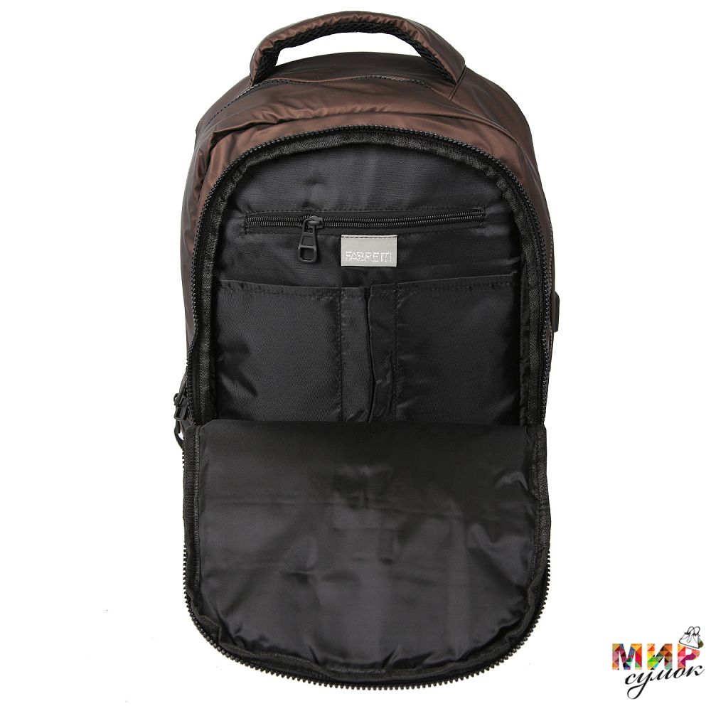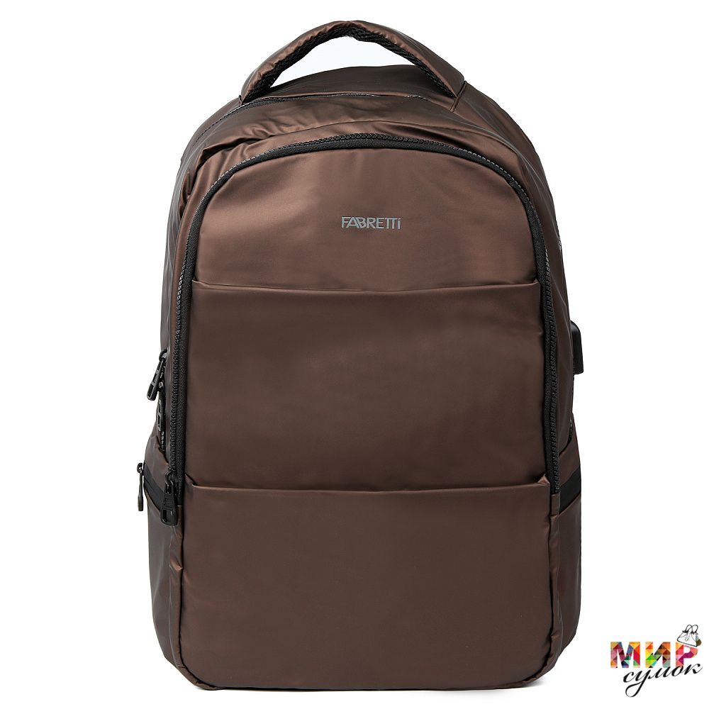 Вместительный текстильный рюкзак FABRETTI в коричневом оттенке выполнен из высокотехнологичного влагостойкого нейлона и оснащен USB-кабелем и USB-портом. Основное отделение закрывается на молнию с 2 бегунками. Внутри расположен usb-кабель и отделение с хлястиком на липучке, куда поместится планшет или электронная книга. Дополнительное отделение закрывается на полукруглую молнию. Внутри 2 открытых боковых кармана и органайзер для ручек. На лицевой стороне есть 2 кармана на молнии. Также имеются два боковых кармана быстрого доступа на влагостойкой молнии и потайной вертикальный карман на спинке. Сверху изделия – удобная текстильная ручка. На спинке есть мягкая вставка, которая обеспечивает циркуляцию воздуха для максимального комфорта и удобства. Лямки рюкзака широкие и мягкие, что позволит носить его, не перегружая плечи и спину. Рюкзак прекрасно подойдёт для прогулок по городу, велосипедных поездок или путешествий и поможет обеспечить бесперебойную работу необходимых гаджетов.