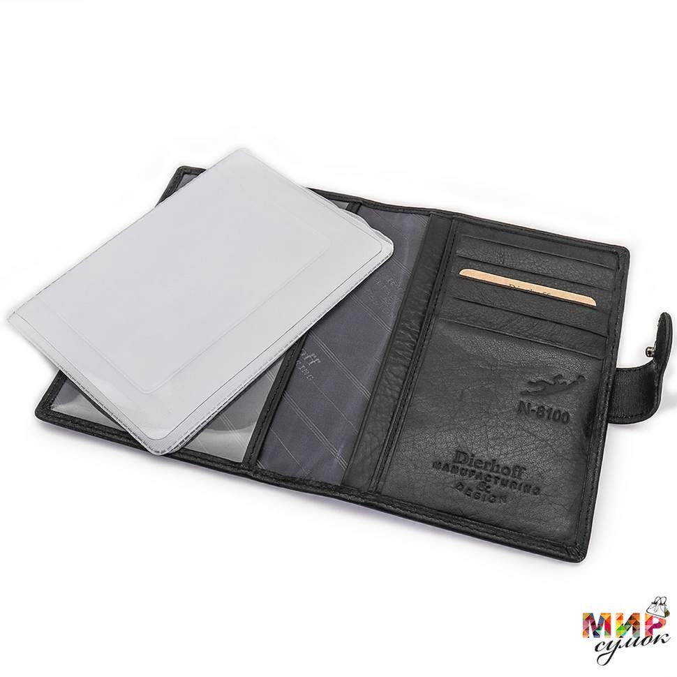 Мужская кожаная обложка для автодокументов от Dierhoff. Закрывается на хлястик с кнопкой. Внутри: слева - прозрачный захват и текстильная подкладка, справа- кожаный захват, продольный карман и пять кармашков для пластиковых карт. Изделие укомплектовано вкладышем с прозрачными файлами для автодокументов.