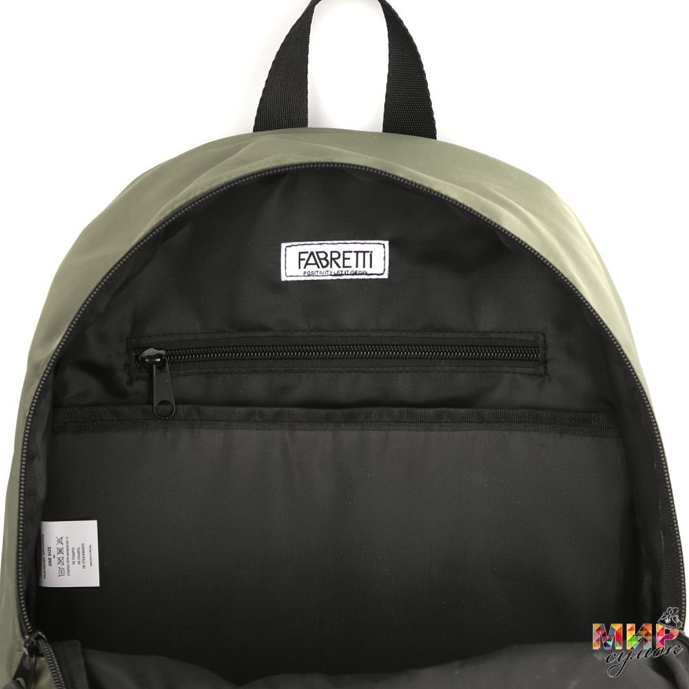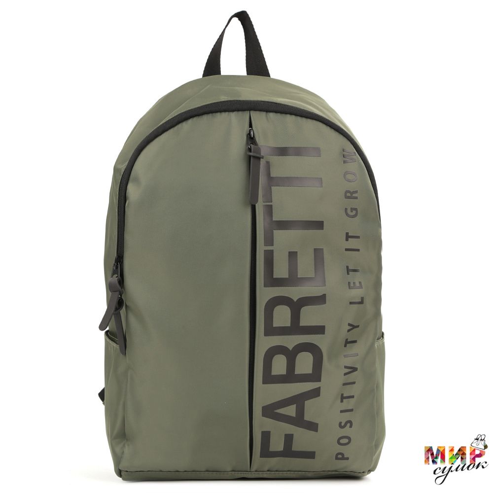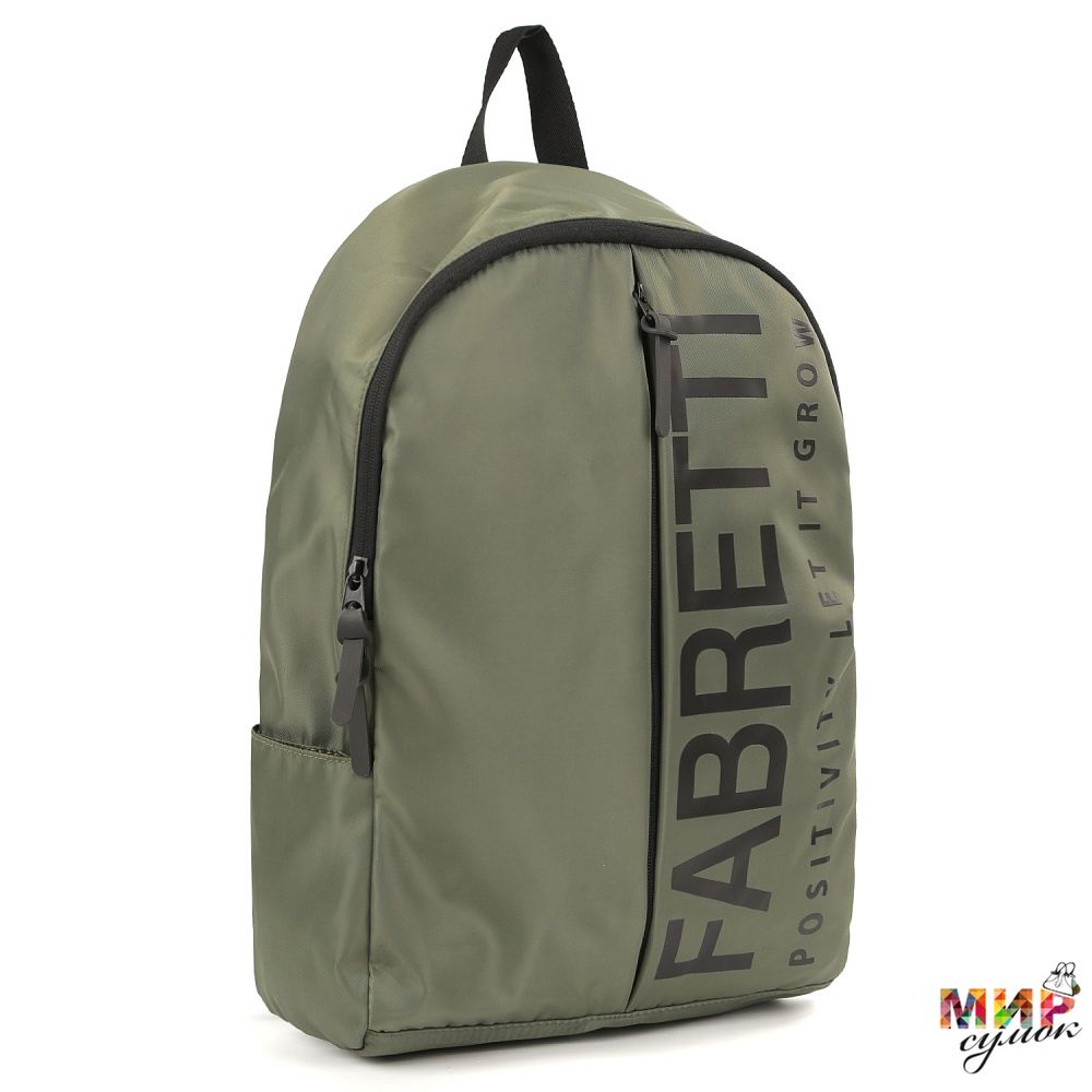 Текстильный рюкзак FABRETTI в зеленом оттенке выполнен из высокотехнологичного полиэстера. Он практичен и прост в уходе. Идеально подойдет для повседневного использования и учёбы, во время поездок и занятий спортом. Основное отделение закрывается на молнию с 2 поводками. Внутри есть карман для мелочей на молнии и открытая секция с мягкой стенкой для гаджетов. На лицевой стороне расположен вместительный карман на вертикальной молнии. По бокам есть 2 открытых кармана для бутылки с водой или зонта. Мягкие плотные лямки (ширина - 7,5 см) регулируются по длине и дополнены вставкой из дышащего материала-сетки. Уплотненная спинка дарит дополнительный комфорт во время использования. Сверху есть ручка, чтобы носить в руке. Вмещает формат А4.