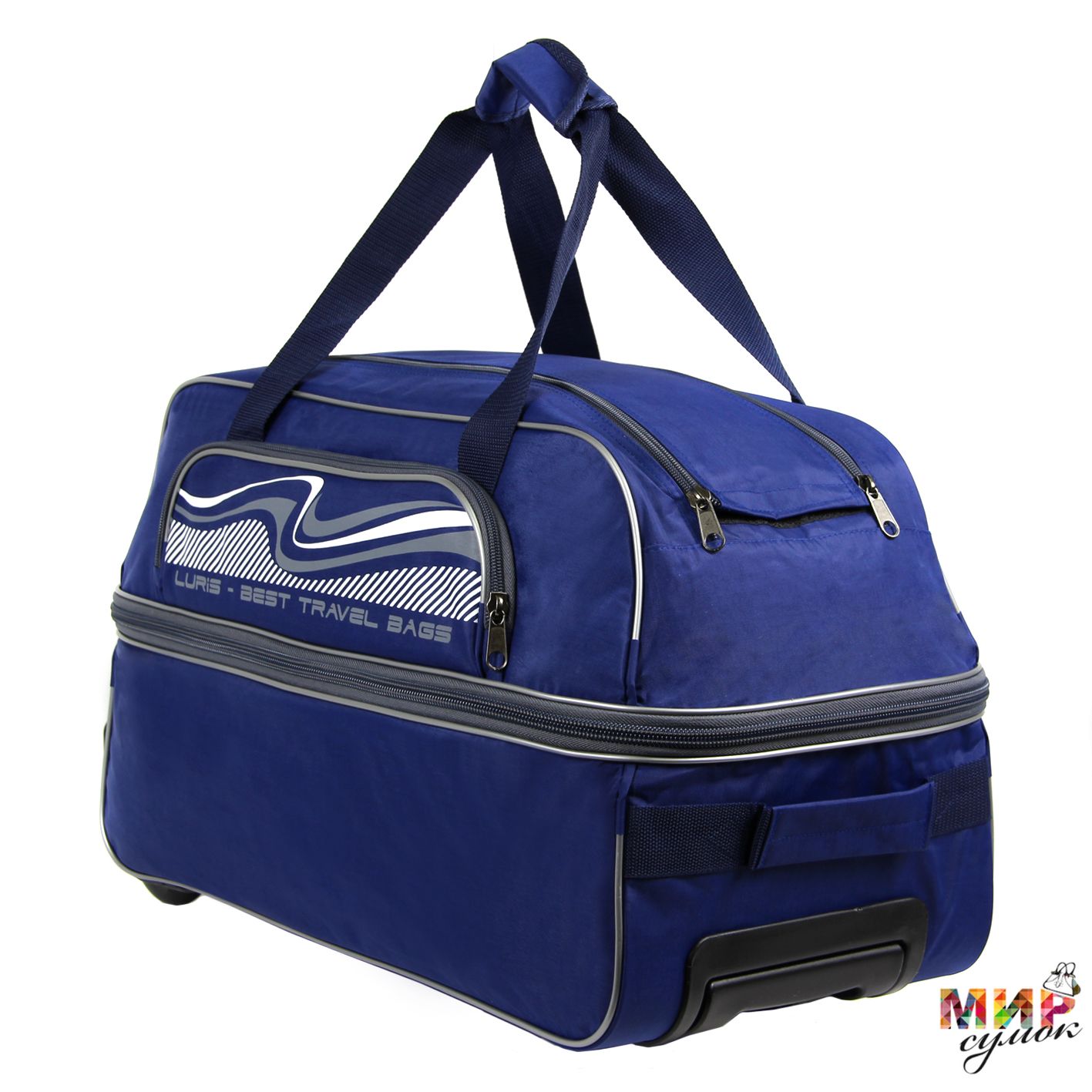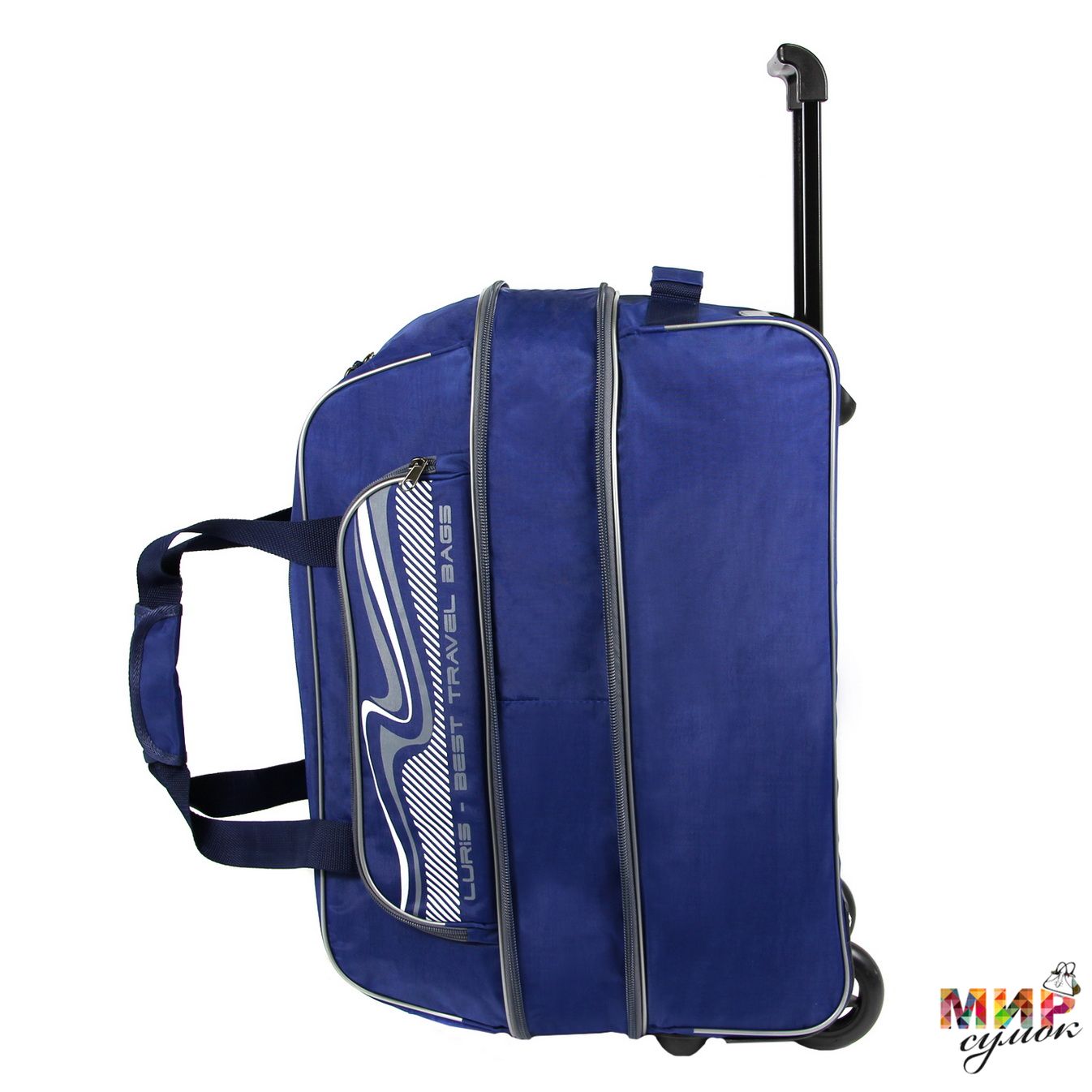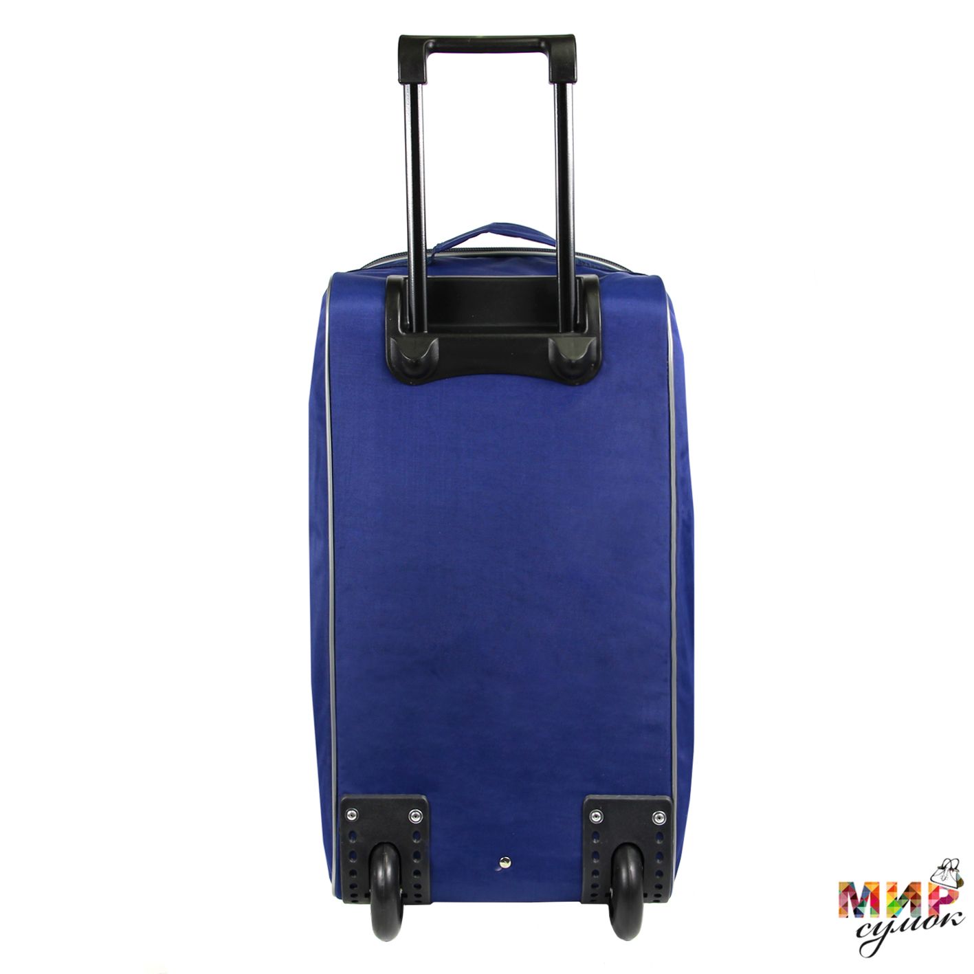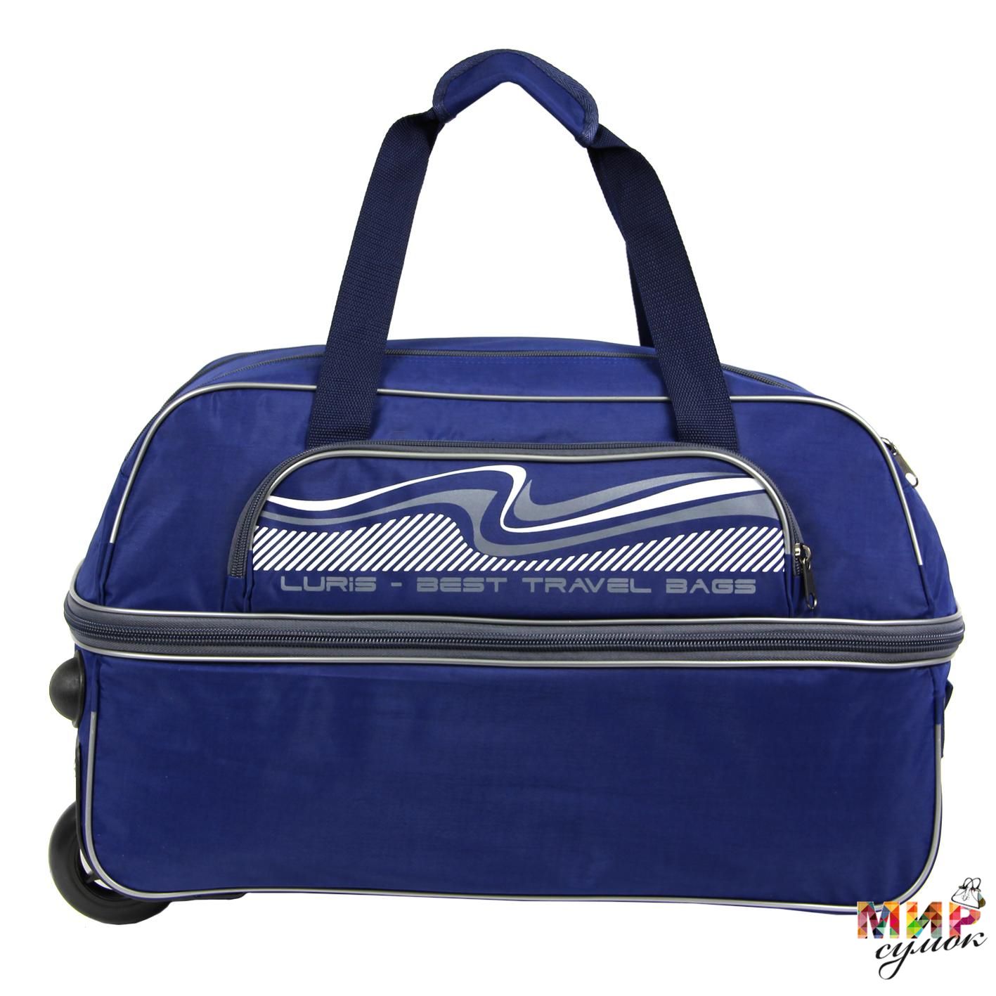 Дорожная сумка на колесах, с выдвижной ручкой, предназначенная для транспортировки личных вещей, изготовлена из прочной водоотталкивающей ткани. Имеется одно вместительное отделение, один накладной карман на передней стенке. Основные ручки оснащены ручкодержателем, боковая ручка с текстильным подручником укреплена строчкой "зигзаг". Сумка трансформируется в высоту на 10 см. Высота выдвижной ручки 35 см.